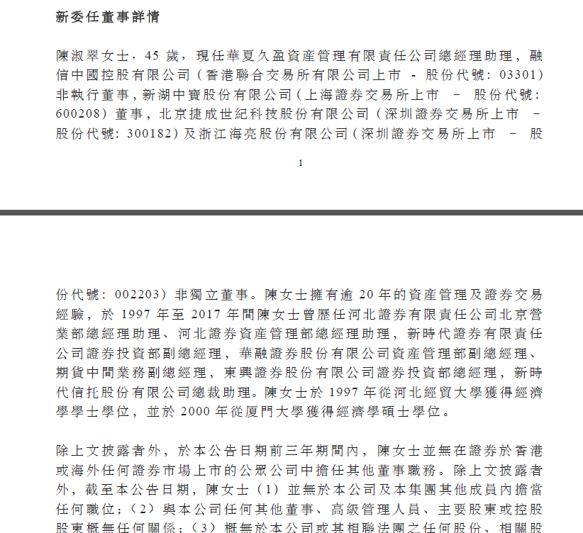 公告称,委任陈淑翠为本公司非执行董事,于2019年12月17日生效。本公司执行董事兼首席执行官汪群斌先生不再兼任本公司提名委员会及薪酬委员会委员,于2019年12月17日生效。