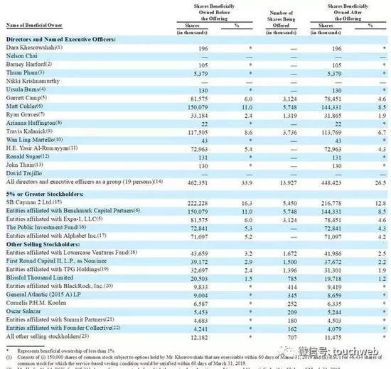 Uber是在2019年5月10日上市,IPO后,软银持股降至12.8%,仍为第一大股东;Entities affiliated with Benchmark Capital Partners持股为8.5%;Entities affiliated with Expa-1, LLC持股为4.6%;