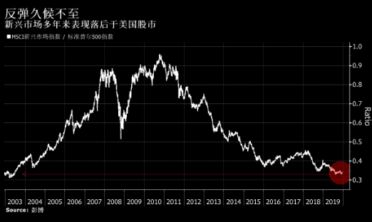 新兴市场股票相对于美国股市的表现距离16年低点只有咫尺之遥,突显了这些市场出现追赶性上涨的潜力。