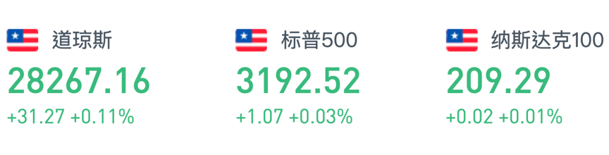 受上周积极消息可能对股市带来长期推动作用影响,周二美股三大股指再创收市新高,录得五连涨。截至收盘,道指报28267.16点,涨幅0.11%;标普500报3192.52点,涨幅0.03%,纳指报8823.36点,涨幅0.1%。