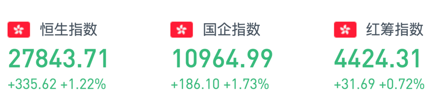 恒生指数开盘高开0.45%,全天震荡上涨。截至收盘,恒生指数涨1.22%,报27843.71点,全日成交额达1053.48亿。国企指数涨1.73%,报10964.99点,红筹指数涨0.72%,报4424.31点。