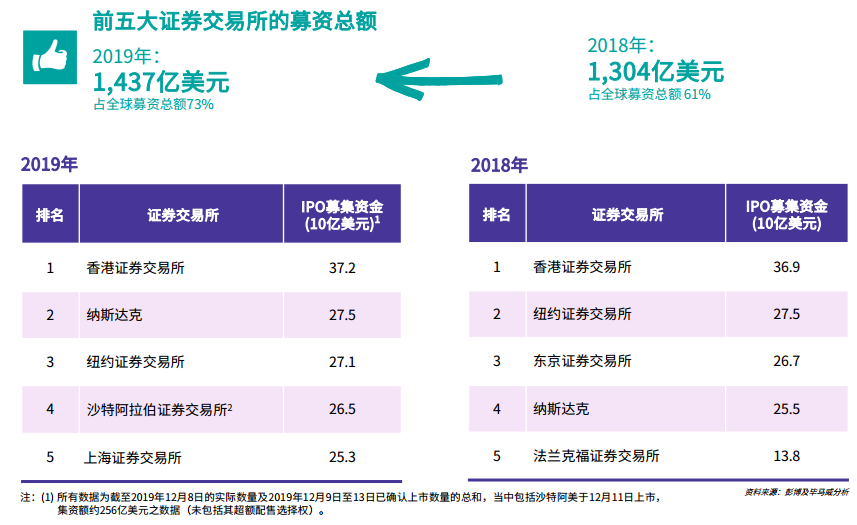 截止2019年12月13日,全球前五大交易所募资总额为1437亿美元, 超过了2018年全年1304亿美元。