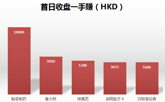 2019年度首日收市一手收益最高的是医药股翰森制药,每手收益可达10480港元,排名其后的是鲁大师、坤集团、启明医疗B和日照港裕廊,每手收益都在5000港元以上。