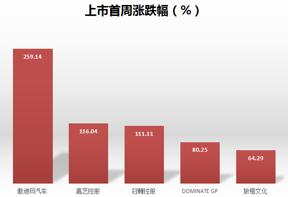 首周涨幅榜排名靠前的还有嘉艺控股、冠轈控股、DOMINATE GP、旅橙文化,涨幅为116%、111%、80.25%以及64%。