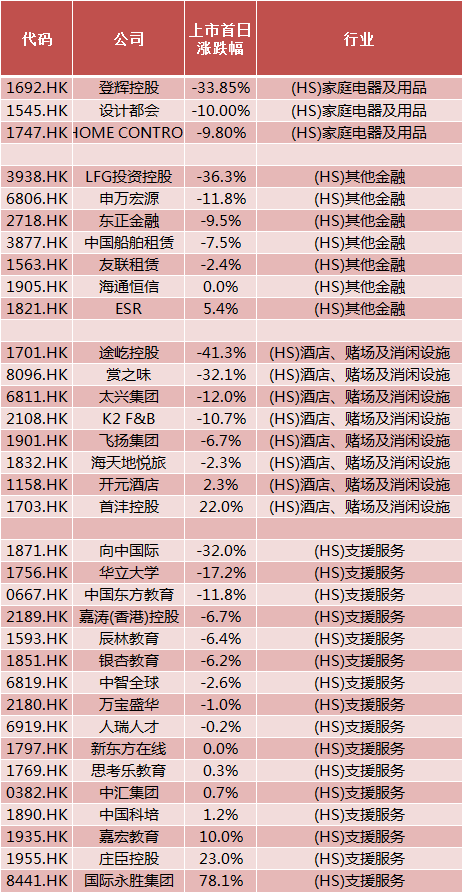 第二个是金融行业,七只个股之中首日收涨的仅有一只。还有酒店以及休闲板块的8家公司,只有两家能够收涨。教育板块一直以来是港股特有的一个行业板块,但受到政策影响,也使得新股市场上的表现受到压制。