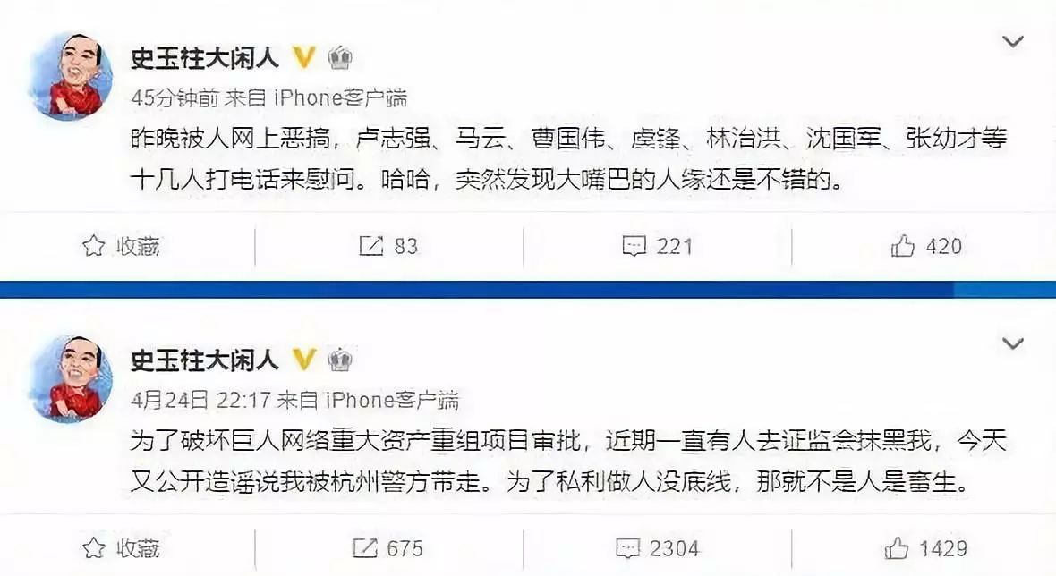 如今,梦是做歪了,人也陷入麻烦,被流言包围。有传他被证监会调查了,有传他被警方逮捕了,害得他赶紧在微博上辟谣,并拉出一串企业家朋友的慰问名单来给自己背书:卢志强、马云、曹国伟......