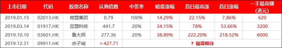 赤子城有靓眼的用户数量、良好的经营业绩、AI以及大数据概念,再加上鲁大师等上市之初暴涨给香港投资者留下的美好记忆,赤子城受到众人追捧就没有那么出人意料了。另外,过往一些同行业公司,如微盟集团、豆盟科技、鲁大师等,历史上在香港首日上市都取得了不错的涨幅,这一数据也在一定程度上增加了投资者们的信心。赤子城科技会像其它同行业公司一样为投资者带来丰厚回报吗?让我们12月31日一起揭晓答案。
