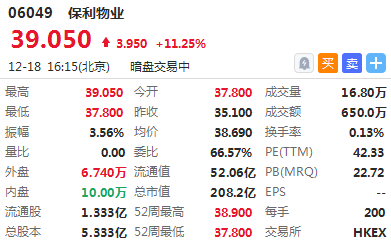 华盛资讯12月18日周三消息,今日下午2只新股有暗盘交易,其中保利物业暗盘高开7.69%,截止16:16,报价39.05港元,较发行价涨11.25%,成交650万港元,最新总市值 208.2亿港元。