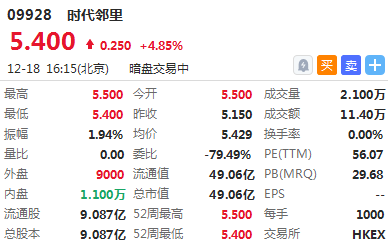 截止16:16,时代邻里暗盘报价5.4港元,较发行价涨4.85%。
