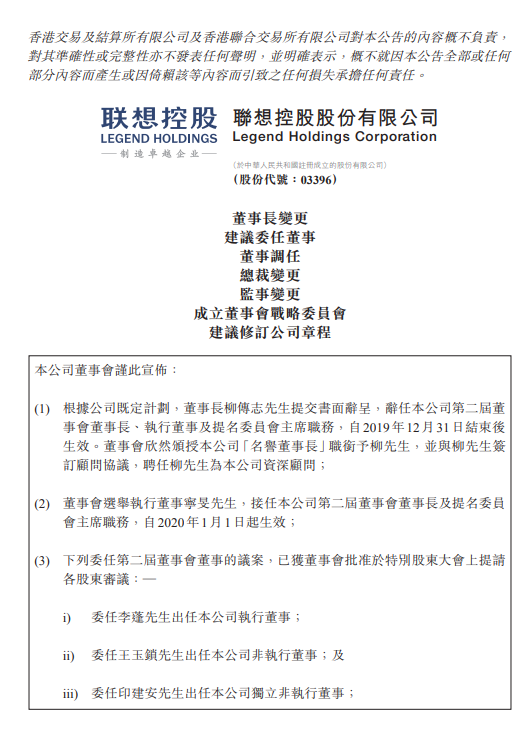 联想控股晚间公告称,公司董事会颁授公司名誉董事长职衔予柳传志,并与柳传志签订顾问协议,聘任柳传志为公司资深顾问;同时,董事会选举执行董事宁旻,接任公司第二届董事会董事长及提名委员会主席职务,自2020年1月1日起生效。