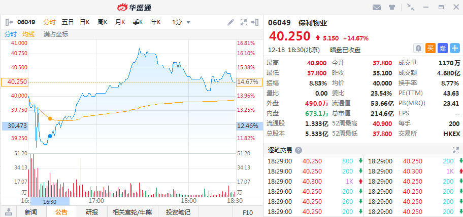 华盛资讯12月18日周三消息,保利物业暗盘涨幅稳定,高开7.69%后涨幅保持在10%以上,最终收涨14.67%,若暗盘收盘卖出一手可赚1030港元,成交额4.68亿港元,最新总市值214.6亿港元,从100%的中签率来看,这次看好保利物业的打新股民基本吃上了肉,另一只物业股时代邻里开盘价表现不错涨近5%,最终平收,两只物业股明日首挂表现值得期待。