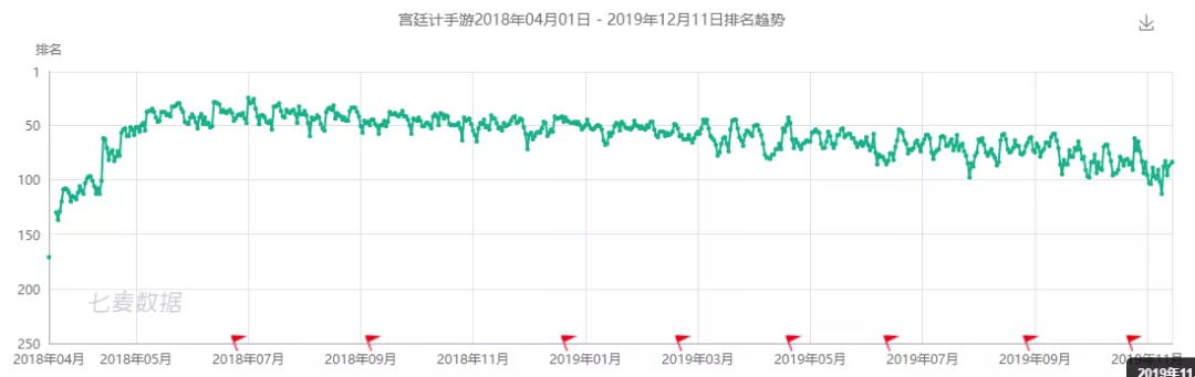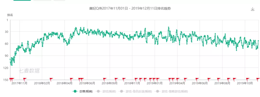 熹妃Q传2017年上线,至今已运营超过两年,畅销稳定在40名左右,2019年的流水也保持稳定。