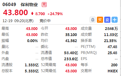 华盛资讯12月19日周四消息,今日有2只新股挂牌,保利物业首日高开24.79%,报价43.8港元 ,截止9:25,该股成交额11.83亿港元 ,最新市值233.6亿港元。此前暗盘收涨14.67%,若暗盘收盘卖出一手可赚1030港元,中签率100%人手一签,暗盘和首日开盘表现都这么好,可谓是雨露均沾的物业股大肉签。