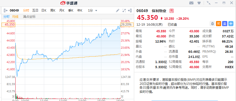华盛资讯12月19日周四消息,保利物业首日挂牌收涨29.20%,报价45.35港元,若以发行价35.1港元买入,一手赚2050港元,成交额37.42亿港元,市值达241.8亿港元。而时代邻里收跌5.24%,一手蚀270港元。