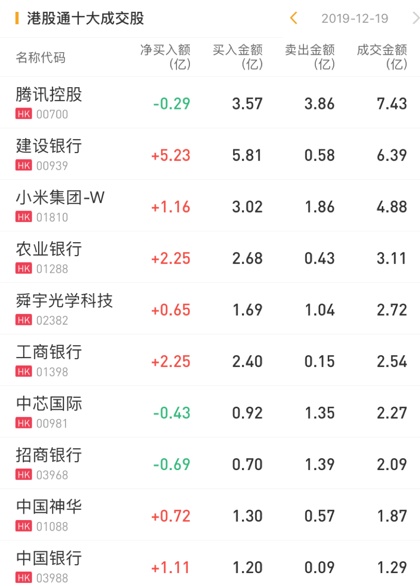 今日南下资金净买入小米集团1.16亿港元,净买入农业银行2.25亿港元,净买入工商银行2.25亿港元,净买入建设银行5.23亿港元;净卖出招商银行0.69亿港元。