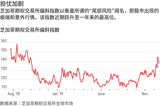 Cboe Global Markets数据显示,这种做空需求推动芝加哥期权交易所偏斜指数(Cboe Skew Index)在上周五升至2018年9月以来的最高位。该指数以衡量股市出现极端和意外行情即“黑天鹅”事件的预期而闻名,按照与标普500指数当前点位相差较大的期权价格来计算。