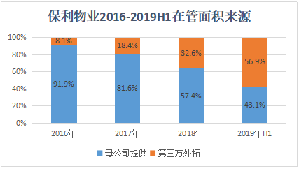 在管面积中,来自于保利发展提供的面积为1.12亿平方米,占比为43.1%,这一体量本身已超过不超物业公司。但同时也可以看到,除了承接来自于母公司的业务,保利物业这几年有意地进行外部拓展,第三方比例从2016年的91.9%降至如今的不足五成。