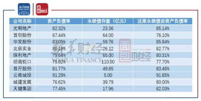如果把部分上市房企发行的永续债还原至负债项,那么这些企业的资产负债率会有较为明显的上升。其中,上升幅度超过3个百分点的企业包括首创股份、城建发展以及天健集团。下表为根据三季报数据整理的部分房企还原永续债后的资产负债率: