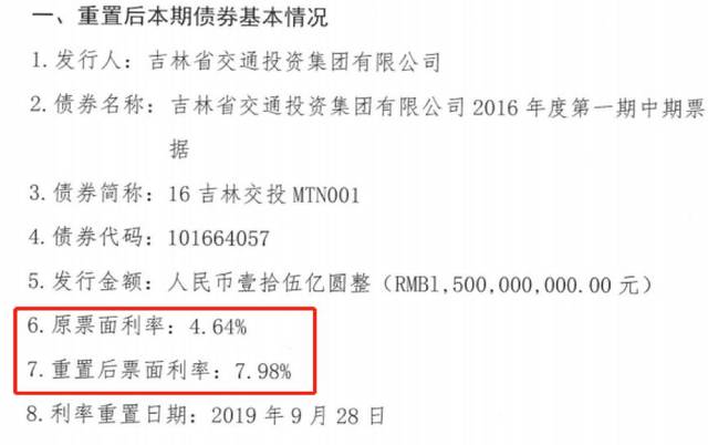 2019年9月底,吉林省交通投资集团有限公司公告“16吉林交投MTN001”票面利率重置结果,其票面利率由原来的4.64%上升至7.98%,增长超过3个百分点。值得一提的是,这也构成了首单城投永续债延期。