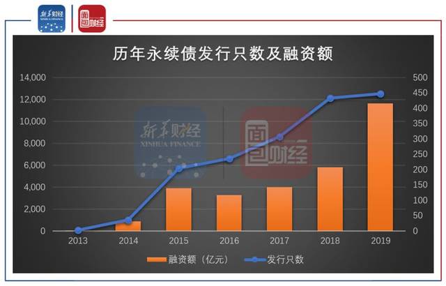 永续债是指没有明确到期时间或到期时间非常长的债券。新华财经和面包财经研究员梳理公开数据发现,2013年以来我国的永续债发行只数和融资额度均呈现快速增长趋势。从发行数量看,由2013年2只上升至2019年截至12月16日的448只。同期融资金额由33亿元快速上升至超过1万亿元。