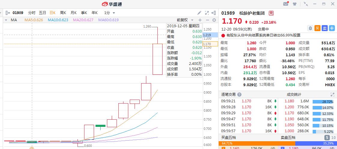 新浪港股讯 12月20日消息,松龄护老集团延续涨势,再度暴涨23%,最高见12.6港元,自12月12日行情启动以来,7个交易日股价翻倍,暴涨100%。