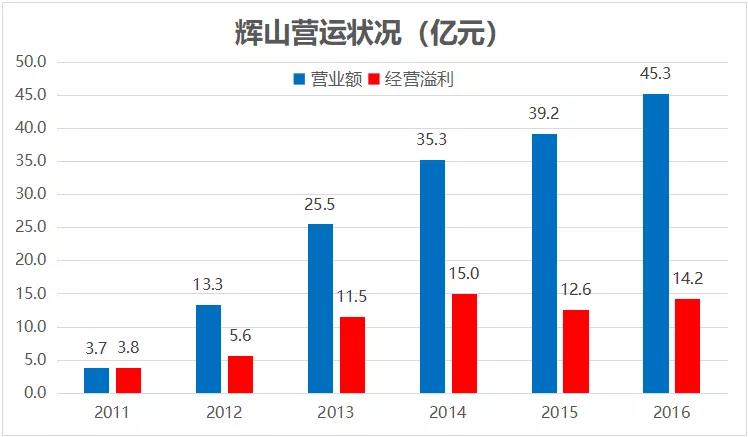 从2011年至2016年间,辉山的营收增长11倍至45.3亿,而经营溢利增长270%至14.2亿。