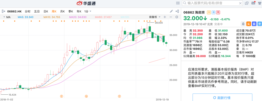 近期海底捞迎来了一波较大幅度的回调,股价从最高点近40港元下跌至32港元左右,跌幅达到20%,那么经历回调后的海底捞是否值得投资呢?