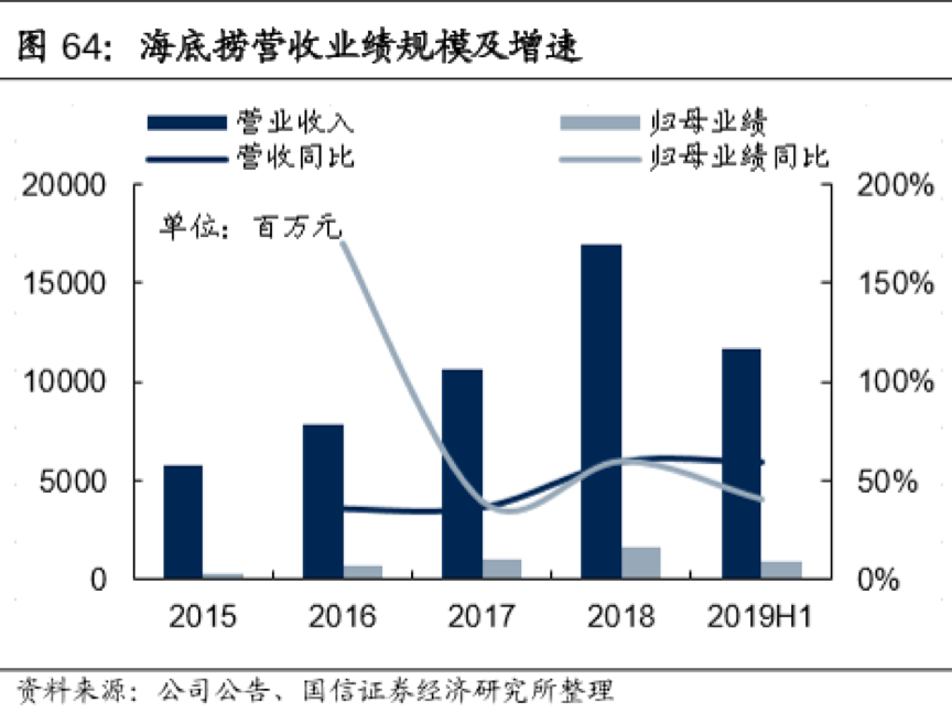 先看业绩增长方面。海底捞上市后一共发布了两份财报,分别是2018年年报和2019年中报。两份财报交出的业绩都是60%左右的营收增长,以及平均50%的归母净利润增长,在业绩的表现上几乎是无可指摘。