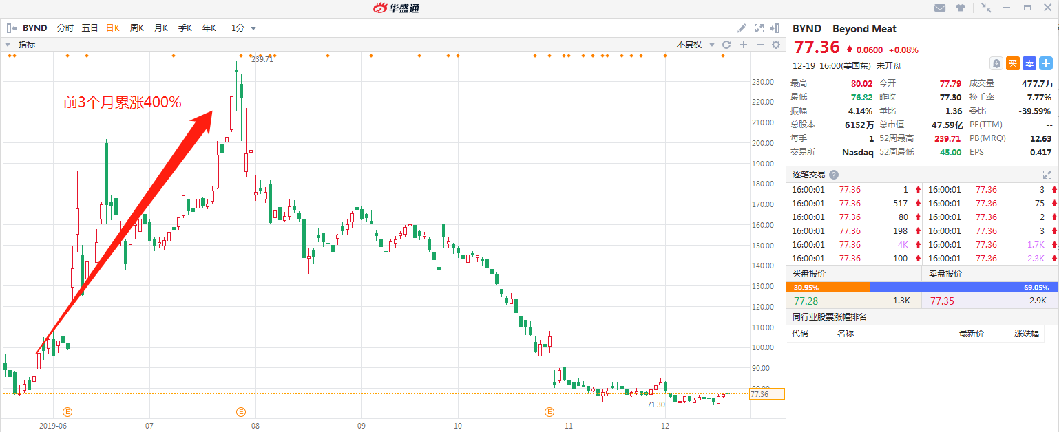 要说2019年美股最具稀缺性的概念,人造肉当之无愧,Benyond Meat作为首只概念股,加上名企和投资大佬加持,一时间半年火遍了资本市场,上市日创造了大涨163%的神话。不过稀缺股不局限于短期热炒,高度稀缺性加良好的财务状况,让这只人造肉股上市前三个月累涨了400%。