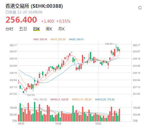 截至12月20日收盘,港交所报收256.40港元,最新市值达3233.72亿港元。