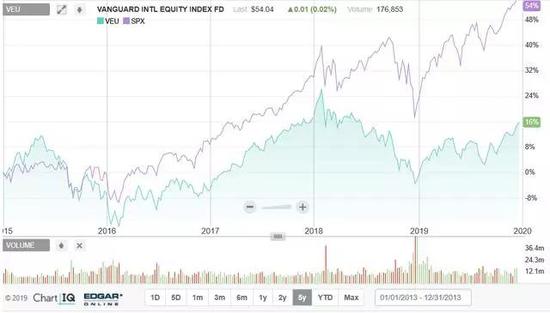 如果你看一下上面的一年的VEU图表,吸引力就不那么明显了。当然,它有上涨的势头,但基本上是追随美国股市的走势,在年初反弹,然后在年中出现几次波动后,在过去几个月大幅上涨。不过,如果你进一步将VEU与标普500指数(S&P 500)进行比较,这种差异就会变得明显起来。