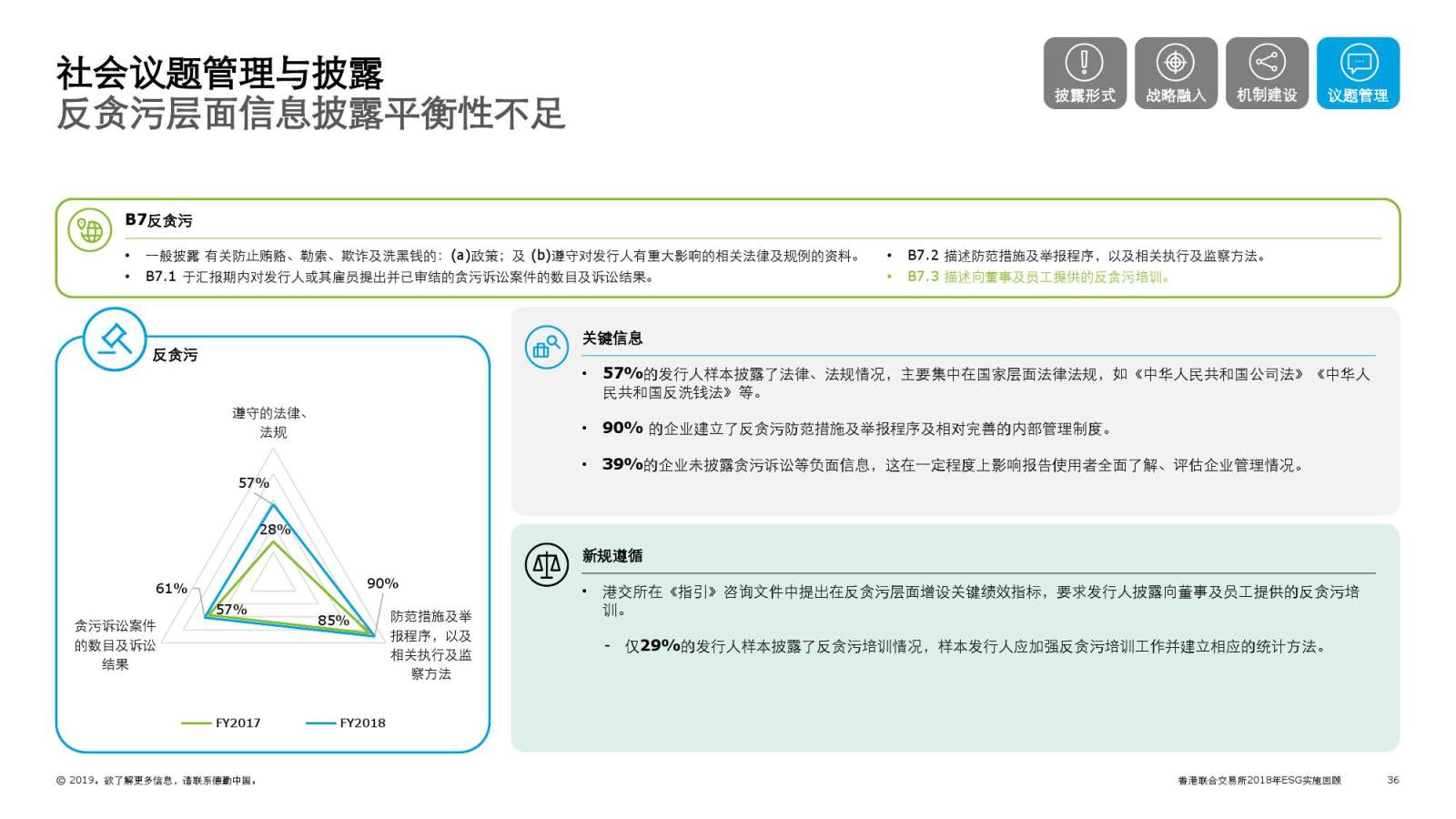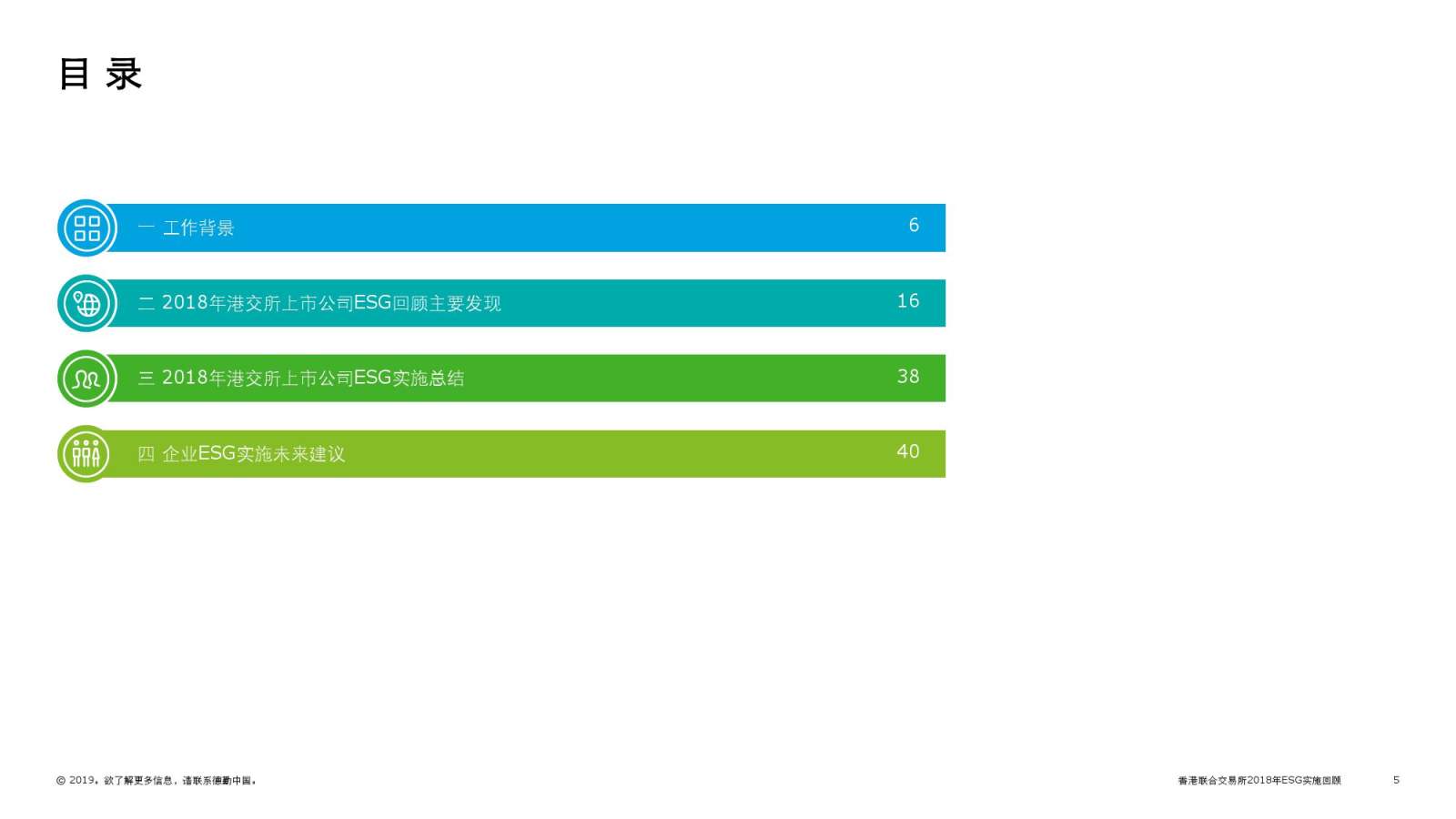 德勤对在港上市企业2018 财年 ESG 信息披露情况开展研究 ,并结合港交所 ESG 指引咨询文件进行分析,旨协助企业及时了解及应对监管动态、合理规划 ESG 管理方案、为企业非财务信息披露及未来 ESG 管理提供建议、帮助企业在可持续发展管理层面进行优化深入。