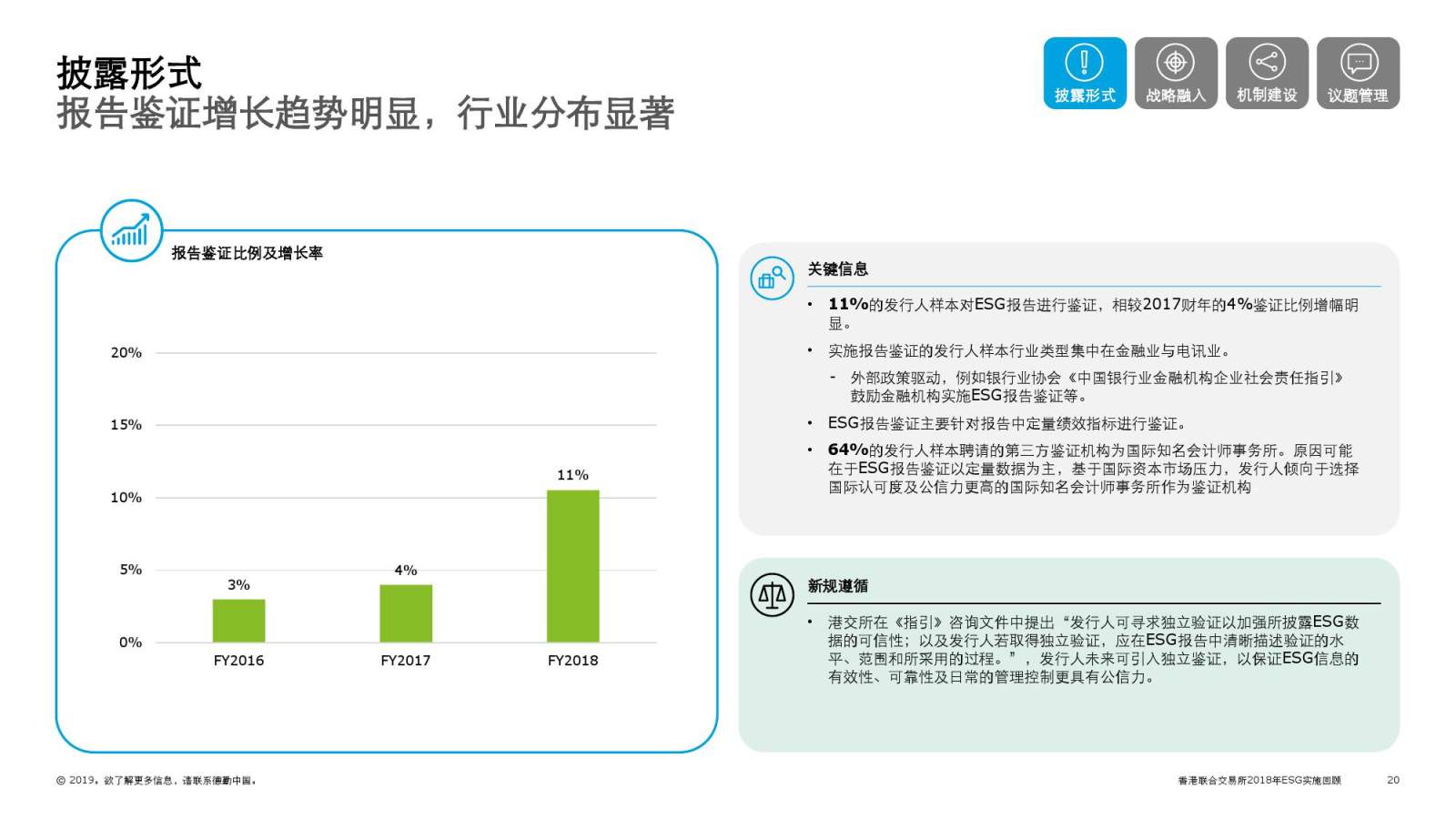 ESG报告披露形式更加丰富,逐步融入国际化的参考指引,主要为全球可持续发展标准委员会GRI标准、联合国可持续发展目标(SDGs);报告鉴证增长趋势明显,11%的企业对ESG报告进行鉴证。• 新规遵循