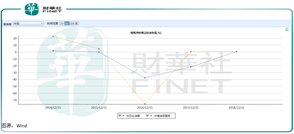 其实这个是油服行业共性。比较中石化油服、中海油服务近五年净利率、毛利率,Wind数据显示,两家都处于薄利寡收的状态。