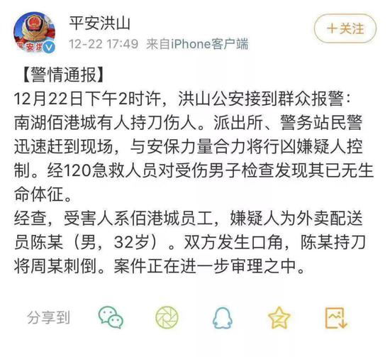 武汉警方通报,南湖佰港城外卖配送员,因发生口角,持刀刺死对方,根据现场图片和视频来看,是美团外卖的配送小哥。