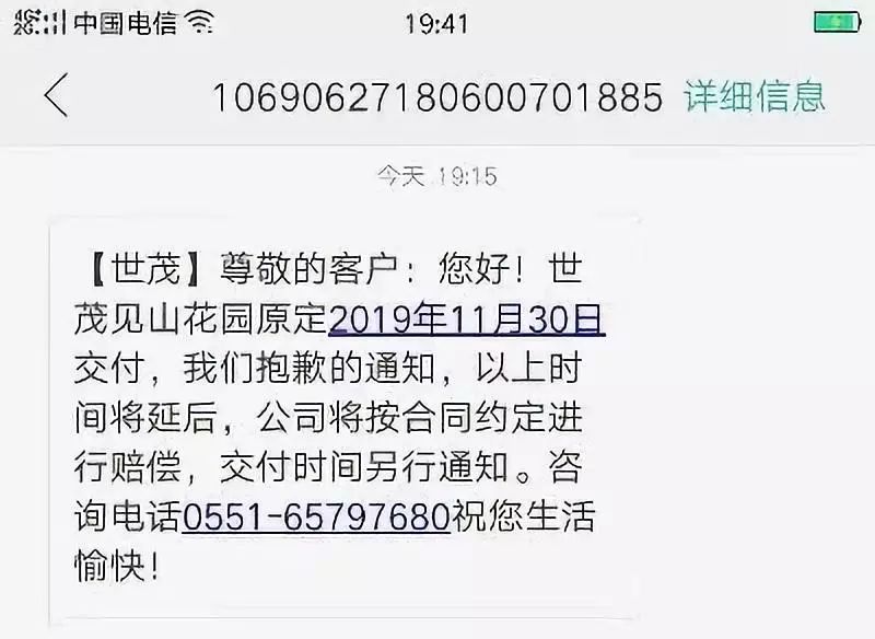 11月29日晚,安徽合肥世茂国风项目一期业主收到了来自开发商的延迟交付短信。