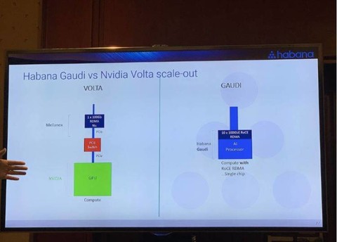 Habana Labs 首席商务官 Eitan Medina(埃坦·麦地那)指出:“我们跟英伟达做得不一致的方面是,直接在单一芯片当中集成了十个支持 RDMA 的端口,而 Tesla V100 要支持 RDMA,必须要通过一个 PCIe(计算机和外部组件连接的接口)的交换,在外面再接一个支持 RDMA 的网卡,这样才能实现 RDMA 的功能。”