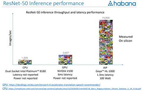 2018 年 9 月发布的 AI 推理芯片 Goya ,在 ResNet-50(深度学习主流网络结构的一种)模型的推理测试上,其图片处理性能近 10 倍于普通 CPU,4 倍于英伟达 Tesla T4。Tesla T4 是英伟达于 2018 年 9 月发布的一款专为 AI 推理设计的 GPU。