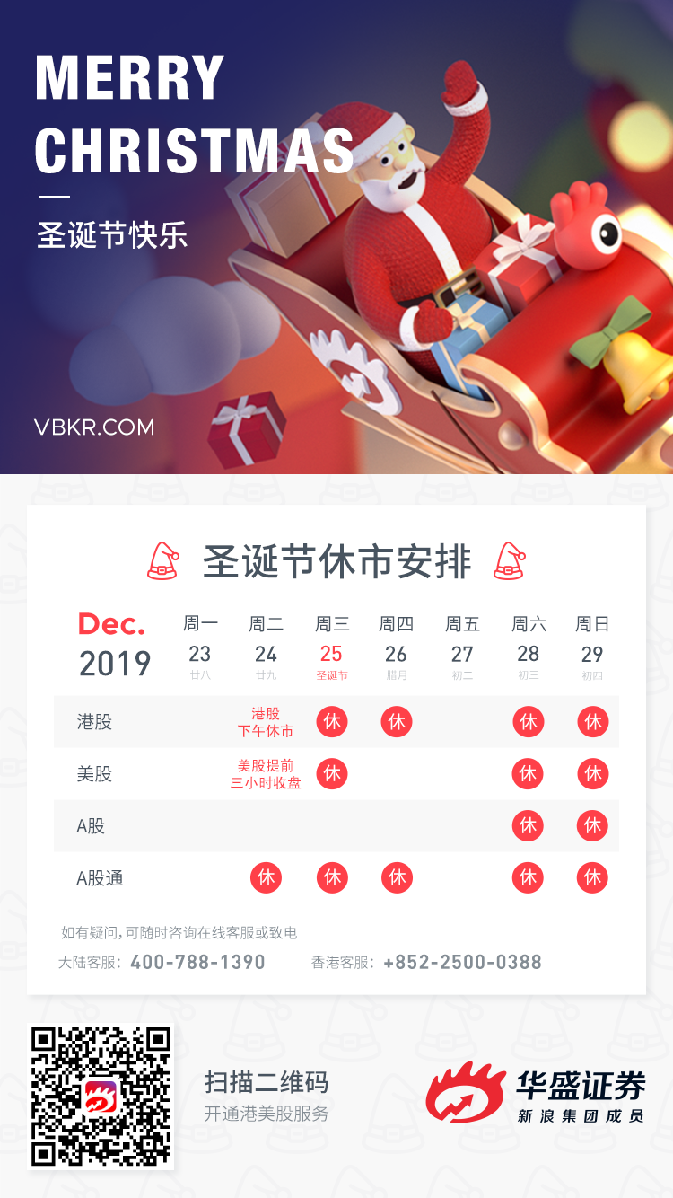 本周三将迎来2019年最后一个西方节日——圣诞节,港股和美股市场将有不同的休市安排。其中港股休市2.5天,从周二下午开始至周四,比美股还要多出1天。平安夜美股提前三小时收盘,直至圣诞节结束。华盛在此提前祝各位圣诞快乐!