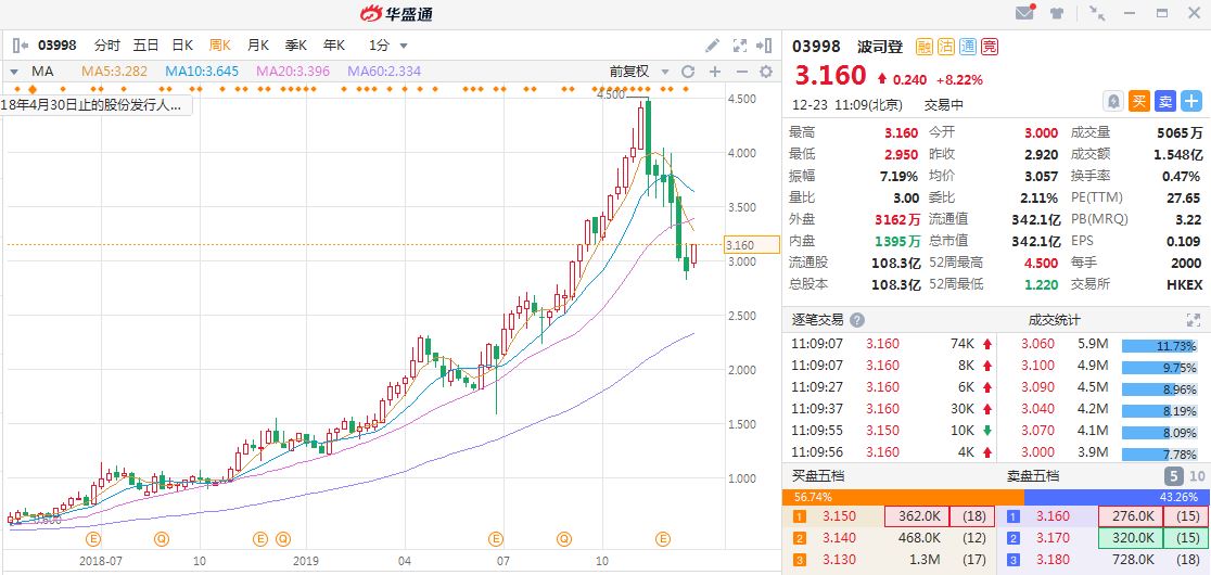 新浪港股讯 12月23日消息,波司登触底反弹,大涨8.22%,报价3.16港元,最新市值342亿港元。截至昨日,公司股价自今年高点暴跌35%,市值蒸发170亿港元。
