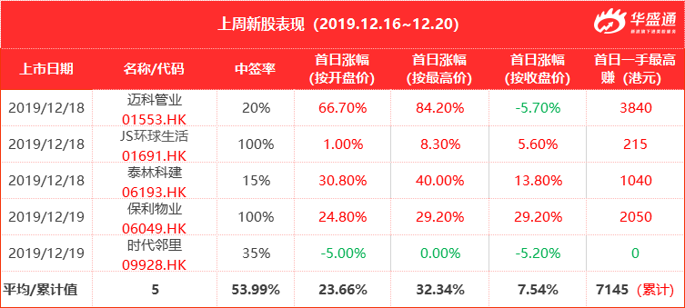 上周5支新股上市,平均中签率约54%,首日上涨3只,首日上涨概率60%。平均收盘涨幅7.54%,首日一手中签收益最高累计达7145港币。