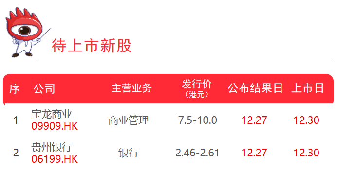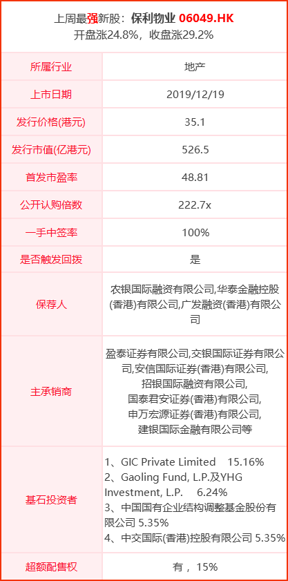 年底新股一波未完一波又起,红包发不停,100%中签的保利物业,让不少打新族感受到了港股新股的美好,接着被热棒的赤子城科技招股期间获超765倍超购,接下来我们详细说说上周新股表现及本周挂牌和招股的新股。