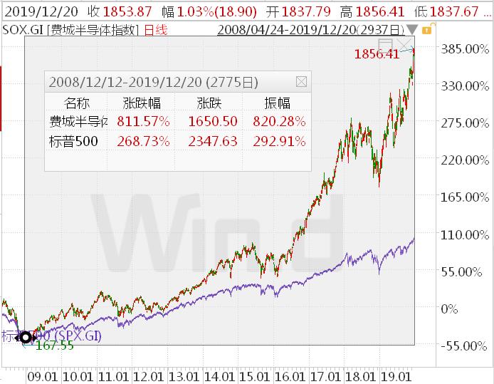 Wind 数据显示,费城半导体指数近10年涨幅远远超过了同期的标普50指数。其成分股中,博通在2009年上市,当时股价不足15美元,近一月最高股价为331.20美元,涨幅超过20倍。美光科技2008年低点为1.59美元,上周五收盘价为55.06美元,涨超30倍。跟踪美国25大芯片股的VanEck Vectors Semiconductor ETF 近十年的收益率也到到了400%!