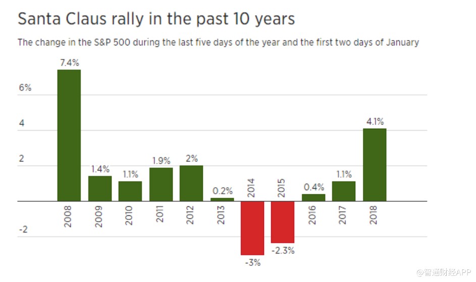 本周开始,美股将正式进入所谓的“圣诞行情”,几十年以来,美国股市在这一段时间内都会出现短暂上涨。根据数据,美股在年内最后的五个交易日和新年的前两个交易日时往往表现强劲,自1950年来,标普500指数在这一段时间平均上涨了1.3%。