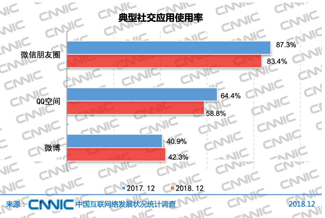 第三方数据也显示,微信朋友圈的活跃度开始下降。今年2月28日,CNNIC发布第43次《中国互联网络发展状况统计报告》显示,截至2018年12月,微信朋友圈、QQ空间用户使用率分别为83.4%、58.8%,较2017年底分别下降3.9、5.6个百分点;微博使用率为42.3%,较2017年底上升1.4个百分点。腾讯高级副总裁、微信创始人张小龙也在今年的微信之夜上表示,超过一亿人设置了朋友圈的“3天可见”。