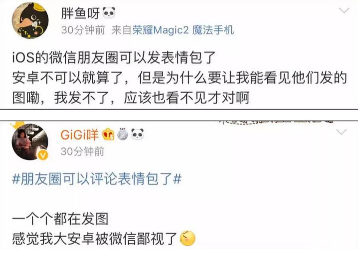 但目前在朋友圈体验上述功能的都是苹果手机的用户,而安卓手机无法参与。更气的是有部分安卓系统用户反应,自己能够在最新版微信朋友圈里看到表情包评论,但却无法发表情包回怼。