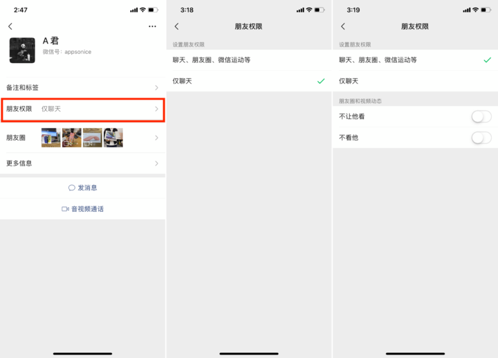 如果你的微信加了或正要添加客户,但并不想让对方窥探到你的私生活,就可以对其设置“仅聊天”权限。点开好友的资料页,在原本的“备注和标签”下方新增了一项“朋友权限”,进入后你可以设置为“仅聊天”,对方将无法看到你的朋友圈、微信运动等信息了。