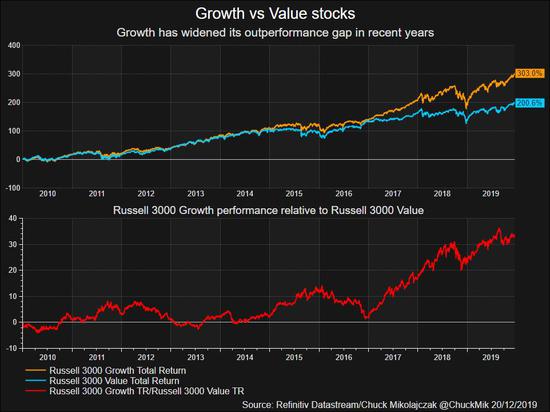 美股的上涨受科技和非必需消费品板块的推动,在过去十年中涨幅均超过300%。能源板块表现最差,勉强避免亏损,在12月19日收盘前仅上涨了4.3%。此外,本世纪初期,投资者几乎没有表现出对成长型或价值型股票的偏好,但在2010年代末期,成长型股票作为一种投资方式已经轻松地超越了价值型股票。