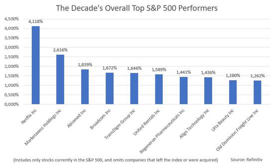 在Netflix的增长带动下,过去十年来个股的表现也反映出了投资者对成长型股票的偏爱。Netflix在12月19日收盘时涨幅达到了惊人的4100%。