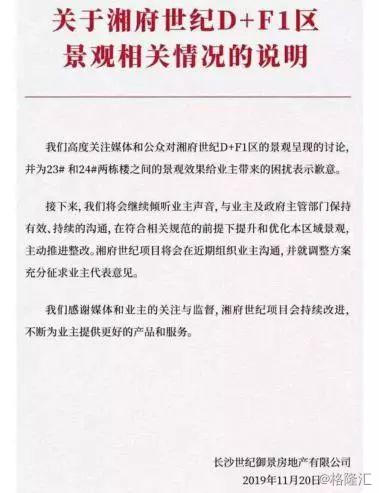 随后,涉事小区的开发商长沙世纪御景房地产有限公司发布了一份《关于湘府世纪D+F1区景观相关情况的说明》,声称将在符合相关规定的前提下提升和优化本区域景观,推进整改,并就调整方案充分征求业主代表意见。
